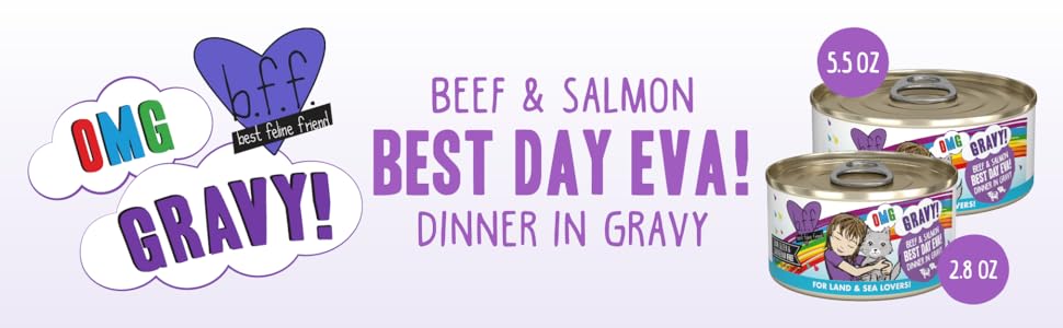 Weruva B.F.F. OMG - Best Feline Friend Oh My Gravy! is a premium cat food featuring a delectable mix of red-meat tuna, wild-caught salmon, and beef, all served in a rich gravy. Each 5.5oz can is grain-free, gluten-free, and free from artificial additives, ensuring your feline friend enjoys a nutritious and flavorful meal. Packaged in a convenient set of 8, this cat food is produced in human food facilities, adhering to the strictest safety standards.