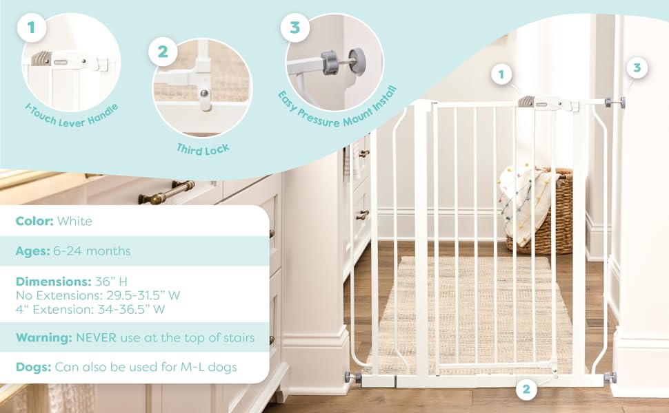 The Regalo Safety Extra Tall Baby Gate is a robust, pressure-mounted steel gate standing 36 inches tall and adjustable to fit openings between 29 and 36.5 inches. Backed by over 30 years of trusted safety testing and double certification, it offers a secure barrier for babies, toddlers, and pets. Designed in America and supported by dedicated US-based customer care, this gate combines reliable protection with easy installation and removal, making it an essential for modern family homes.