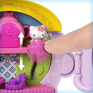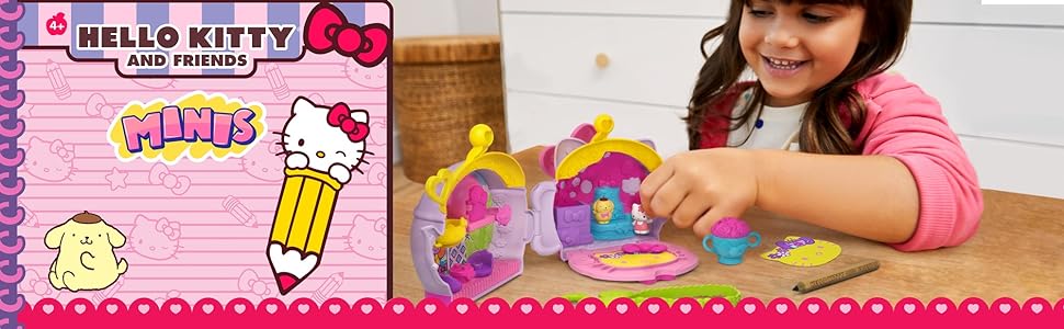 The Mattel Hello Kitty Tea Party Compact is a 4.9-inch portable playset featuring 2 Sanrio Minis figures, a sliding teapot elevator, and a table set for two. It includes a notepad, stencil, and pencil to encourage creativity, requires no assembly or batteries, and is designed for kids aged 4 and up. Perfect for imaginative, on-the-go play and gifting.