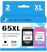 The KCMYTONER Remanufactured 65 XL Ink Cartridge Combo Pack offers a cost-effective solution for high-volume printing, featuring a black cartridge with a yield of up to 450 pages and a tri-color cartridge yielding up to 300 pages. Compatible with various HP printer models, this product includes the latest chip technology for ink level monitoring and is backed by 24/7 technical support.