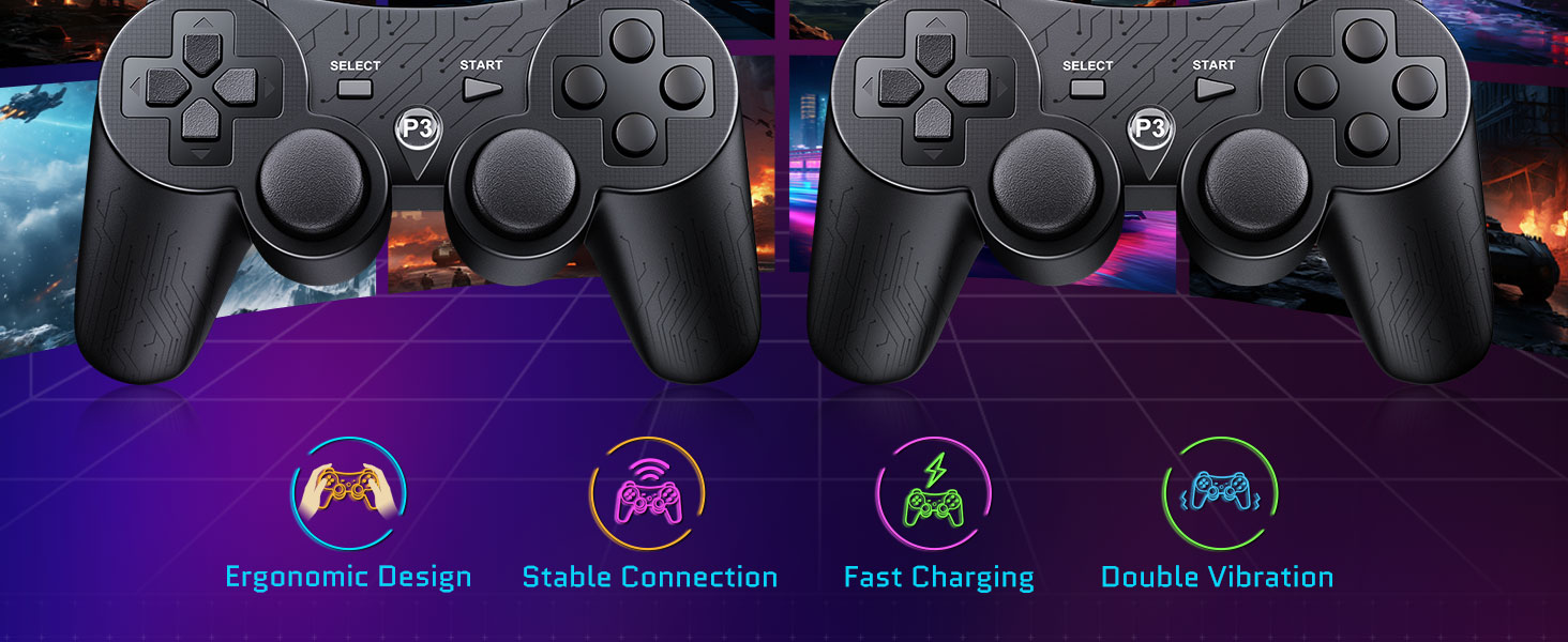 The OKHAHA Controller 2 Pack for PS3 offers a wireless gaming experience with advanced features like Double Shock 3, motion sensing, and a robust battery life. Compatible with both PS3 and PC, these controllers are designed for durability and comfort, ensuring you can game longer and harder without compromise.