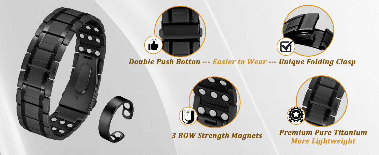This 3X Magnetic Bracelet Set for men features triple-row neodymium magnets embedded in a pure titanium band, offering enhanced magnetic benefits in a lightweight, hypoallergenic, and corrosion-resistant design. Adjustable sizing with included tools ensures a perfect fit, while the innovative folding clasp adds convenience and sophistication. Ideal for daily wear and gifting, it combines cutting-edge magnetic therapy with sleek, durable craftsmanship.