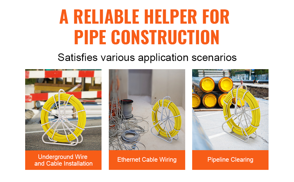 The VEVOR Fish Tape Fiberglass is a 425 ft, 1/4 inch diameter cable pulling tool crafted from non-conductive fiberglass and ABS, reinforced with a rustproof steel frame. Designed for professional electrical and communication installations, it features a sensitive braking system for precise control, three replaceable metal pulling heads to reduce friction, and a durable powder-coated steel reel stand. This tool withstands up to 10KN pressure, resists aging and rust, and includes gloves for safe handling, making it an essential, reliable companion for complex wiring tasks.