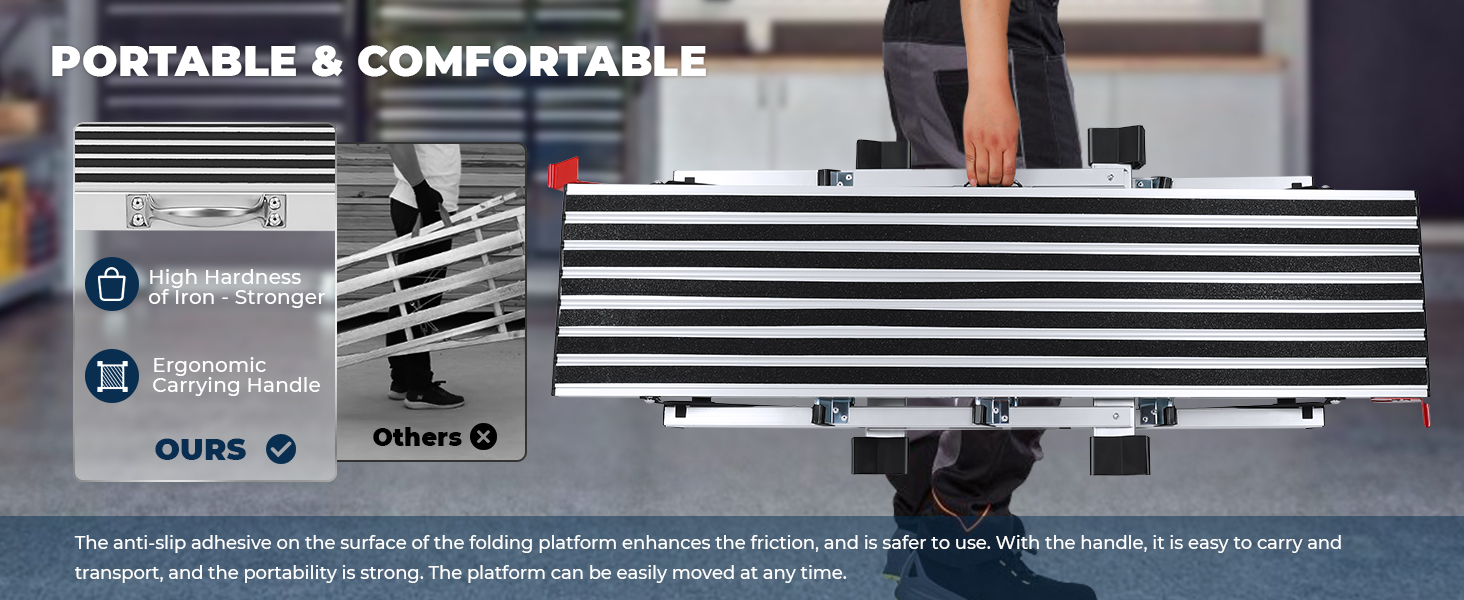 This 50"×12"×27" aluminum two-step work platform combines heavy-duty durability with smart foldability, supporting up to 330 lbs. Featuring dual-sided wide steps, secure metal safety locks, and anti-slip surfaces, it ensures maximum stability and safety for a variety of professional and home tasks.