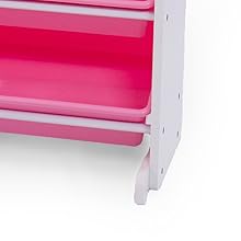 The Humble Crew White/Pink 12 Bin Toy Storage Organizer is a stylish and functional solution for keeping play areas tidy. With a sturdy engineered wood frame and steel dowels, it supports up to 20 pounds per level. Featuring 12 durable, BPA-free plastic bins, this organizer includes 8 standard and 4 large bins that are interchangeable for versatile storage. Safety is prioritized with stabilizing braces and an anti-tip kit, making it a perfect addition to any child's room.