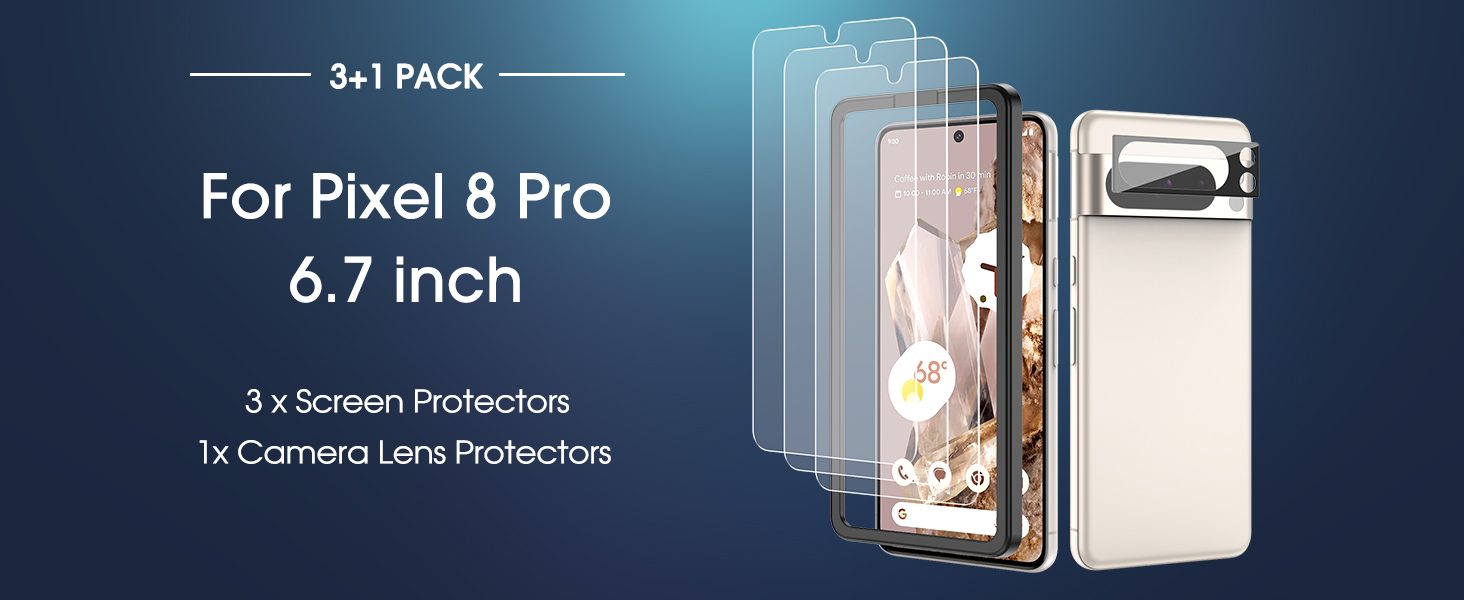 The amFilm 3+1 Pack for Google Pixel 8 Pro offers premium tempered glass screen protection with a remarkable 9H hardness, ensuring durability and scratch resistance. At just 0.33mm thick, it maintains touchscreen sensitivity while providing 99.9% transparency for an optimal viewing experience. The package includes three screen protectors, a camera lens protector, and an easy installation frame, making it the perfect choice for Pixel 8 Pro users seeking both style and protection.