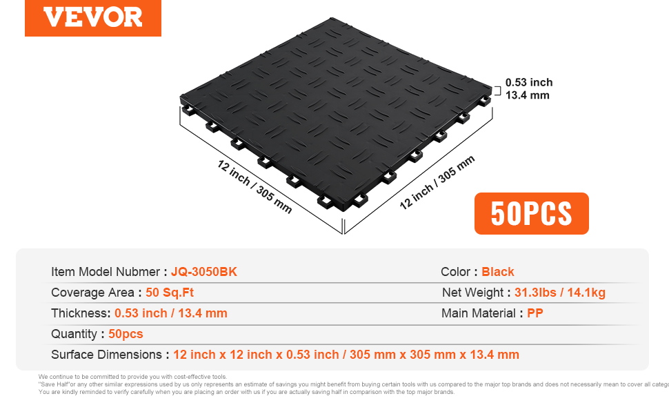VEVOR Garage Tiles are premium 12x12 inch interlocking floor coverings designed for professional and personal spaces. Featuring a robust 0.53-inch thickness and a 5500 lbs load capacity, these double-sided, non-slip tiles offer superior protection and durability. The upgraded 6-loop interlocking system enables quick, tool-free installation, while the 3D diamond texture ensures easy cleaning and lasting grip. Perfect for garages, basements, and repair shops seeking a stylish yet functional flooring solution.