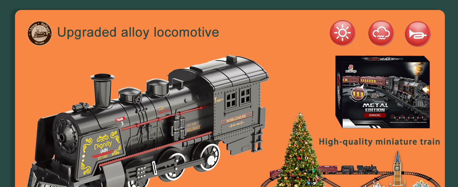 This 2025 upgraded electric Christmas train set features a premium alloy steam locomotive, glowing passenger carriages, and realistic light, sound, and smoke effects. Powered by a rechargeable 1000mAh lithium battery, it offers 210 minutes of continuous play. The set includes a rich variety of modular tracks for customizable layouts, crafted from durable ABS and metal materials, and is certified safe for children aged 3 and up. Perfect for creating immersive holiday memories and encouraging imaginative play.