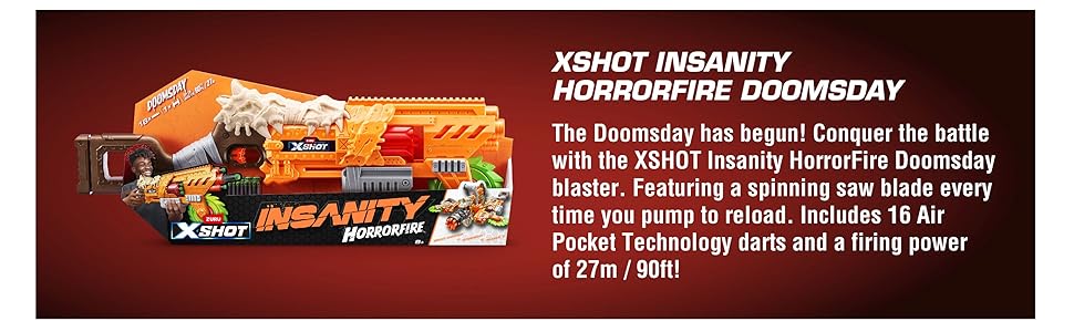 The XSHOT Insanity HorrorFire Doomsday by Zuru is a high-impact outdoor blaster featuring a unique spinning saw blade activated by pumping, an 8-dart revolving drum with a total capacity of 16 Air Pocket Technology darts for enhanced range and accuracy up to 27 meters. Designed for ages 8 and up, it encourages active, interactive play without batteries, and can be combined with other blasters in the Insanity HorrorFire series for amplified fun.