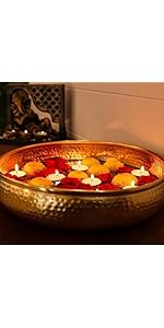The Klassic 10" Hand Crafted Metal Gold Round Hammered Potpourri Bowl is a 25cm diameter aluminium Urli bowl featuring a rust-resistant, hand-hammered golden finish. Designed with integrated handles and a classic Indian tapered shape, it’s perfect for floating flowers or tea light candles, making it an elegant decorative piece ideal for Diwali and everyday use.