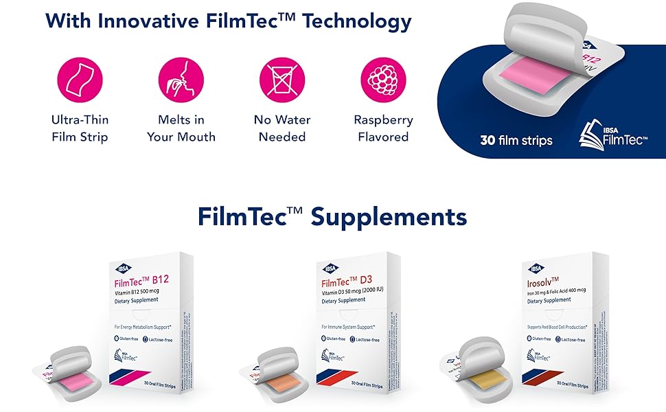 Ibsa FilmTec B12 offers a potent 500 mcg dose of Vitamin B12 in innovative oral dissolving films using IBSA’s FilmTec technology for immediate release. Designed for busy professionals, these gluten-, lactose-, sugar-, and GMO-free raspberry-flavored strips provide a convenient, tastier way to support energy metabolism and thyroid health with a 30-day supply.