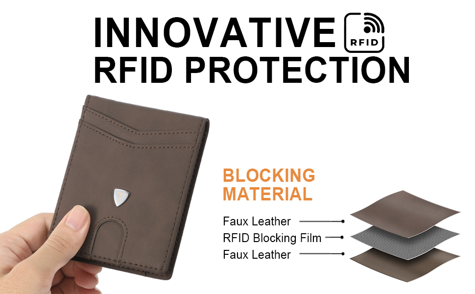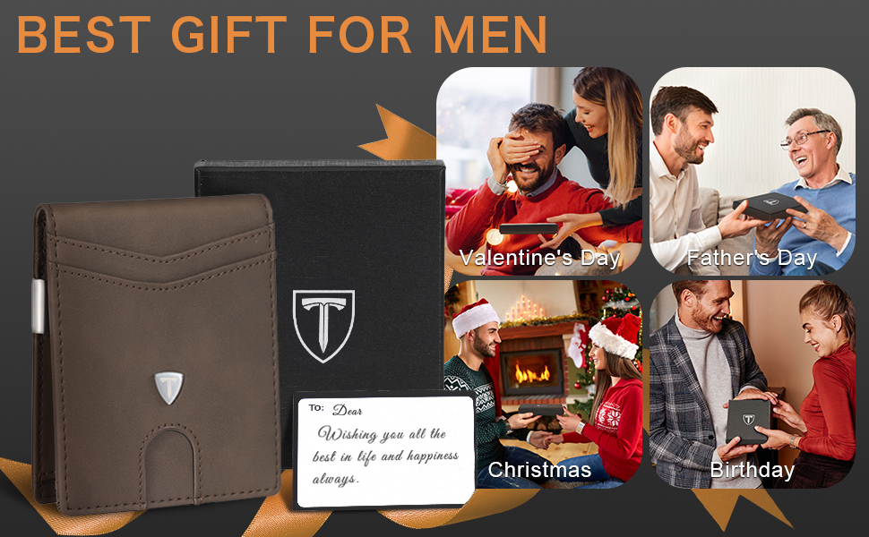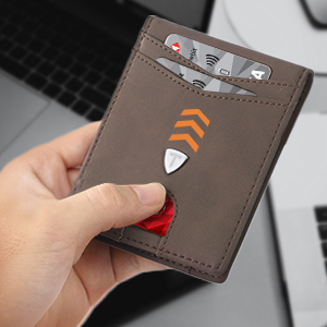 This slim men's wallet measures 11.3 x 8.5 x 1.8 cm and holds up to 11 cards with a strong money clip and ID window. Made from durable faux leather, it features advanced RFID blocking technology to protect your personal data from unauthorized scans. Designed for easy card access and portability, it comes gift-boxed with a personalized message card, making it an ideal stylish and secure gift.