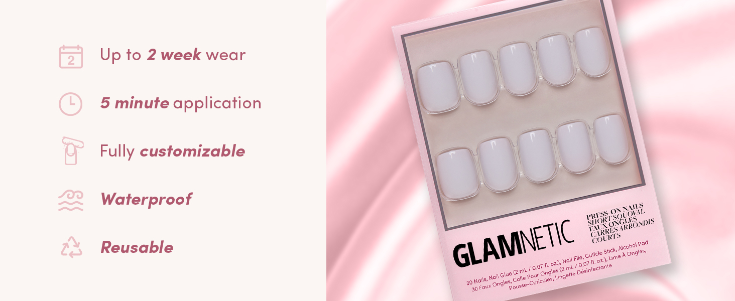 Glamnetic nails are the only press ons that I use. They’re a great value for the money, and look real. I get so many compliments. The color is always great. They provide a bunch of size options which is great. They’re durable, last without breaking and can be reused after cleaning.