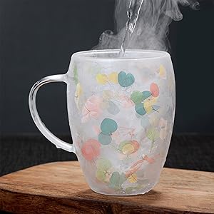 This 280ml double wall glass mug features beautifully suspended dried flowers, crafted from durable borosilicate glass that withstands temperatures up to 180°C. Designed with an ergonomic handle and thermal insulation, it offers a stylish yet practical drinking experience—perfect as a thoughtful gift for women, friends, and loved ones.