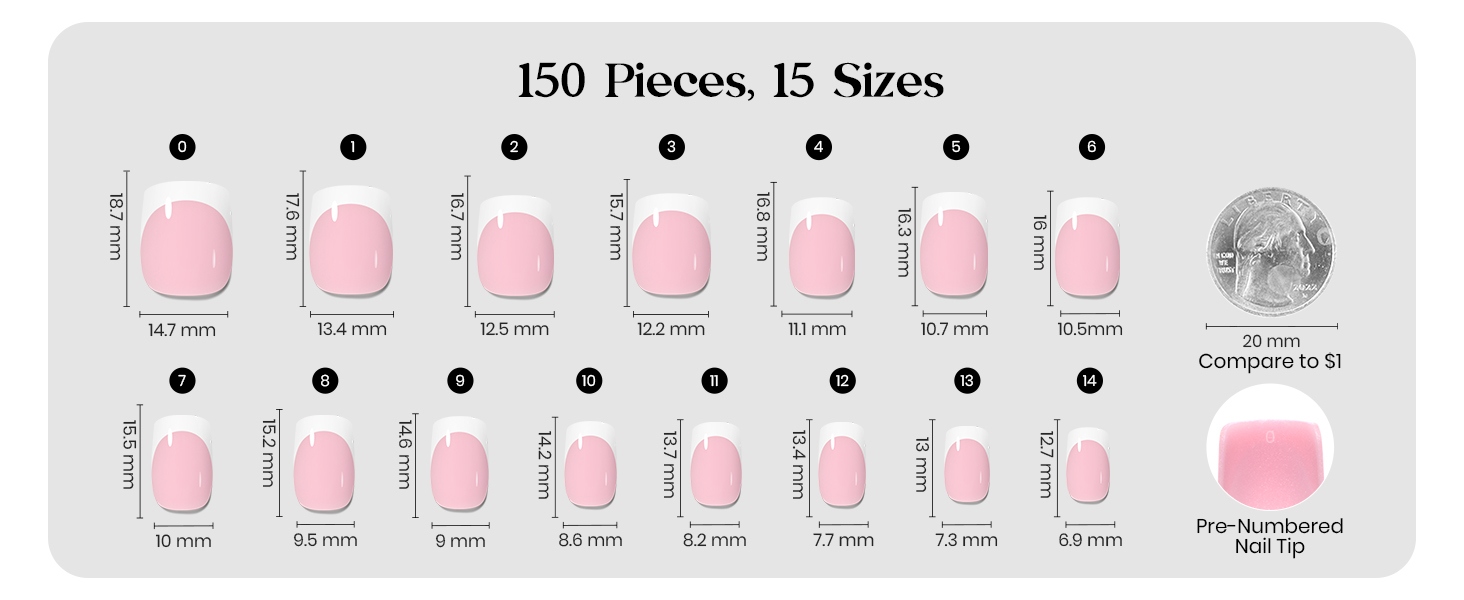 Beetles French Tip Press On Nails offer a 150-piece multi-size set of pre-shaped, short square nails with a 4-in-1 design that mimics salon quality. Designed for quick, no-fuss application without filing or base coats, these durable nails provide strong adhesion and a perfect fit for all finger sizes, making them the ideal DIY manicure solution and gift for nail art enthusiasts.