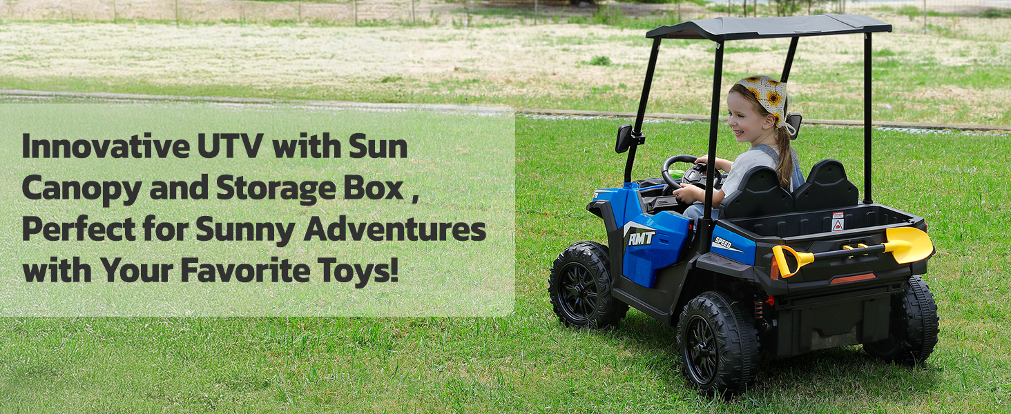 Elemara two-seater electric off-road vehicle. It has many functions. It can play music. Bluetooth, shovel,etc. two babies can sit together without being crowded. There is also a seat belt design. so parents can rest assured.it will attention when you drive it out. Parents can also control the steering wheel with a remote control. It has three speed settings and can bring an exciting experience anytime and anywhere.It’s really great. My two babies like it very much.