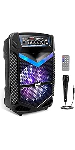 The Pyle 400W Bluetooth Wireless Speaker is a portable PA system featuring an 8-inch subwoofer and 1-inch tweeter for rich, full-range sound. Equipped with Bluetooth streaming, multiple input options including USB and microphone, and a rechargeable battery, it’s designed for versatile indoor and outdoor use. Its lightweight build with wheels and handle ensures easy transport, while colorful DJ lights add a dynamic visual element to any event.
