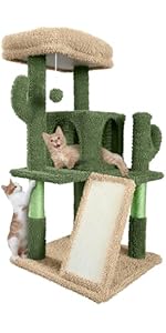 The CAPHAUS Cactus Cat Tree is a 58-inch tall, multi-level indoor cat tower designed for cats of all sizes. Featuring spacious padded perches, a cozy hammock, sisal-wrapped scratching posts, and a roomy condo, it supports natural feline behaviors like climbing, scratching, and resting. Constructed with durable materials and a reinforced base, it safely accommodates multiple cats while adding a unique cactus-inspired aesthetic to your living space.