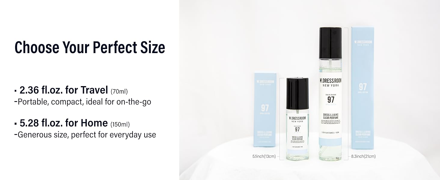 W.Dressroom No.97 April Cotton Perfume is a 5.28 oz water-based body, fabric, and room mist featuring a refreshing citrus musk scent of lime and vanilla. Made in South Korea with safe, non-toxic ingredients, it effectively neutralizes odors on multiple surfaces without residue. Perfect for travel and gifting, it brings a clean, uplifting atmosphere to any space.