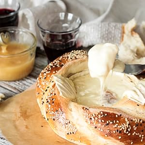 We love this cheese fondue. It’s easy to make-simply warm it up in the fondue pot. The cheese quality is wonderful and the texture is thick and cheesy. This is our go-to cheese fondue meal when we get together!
